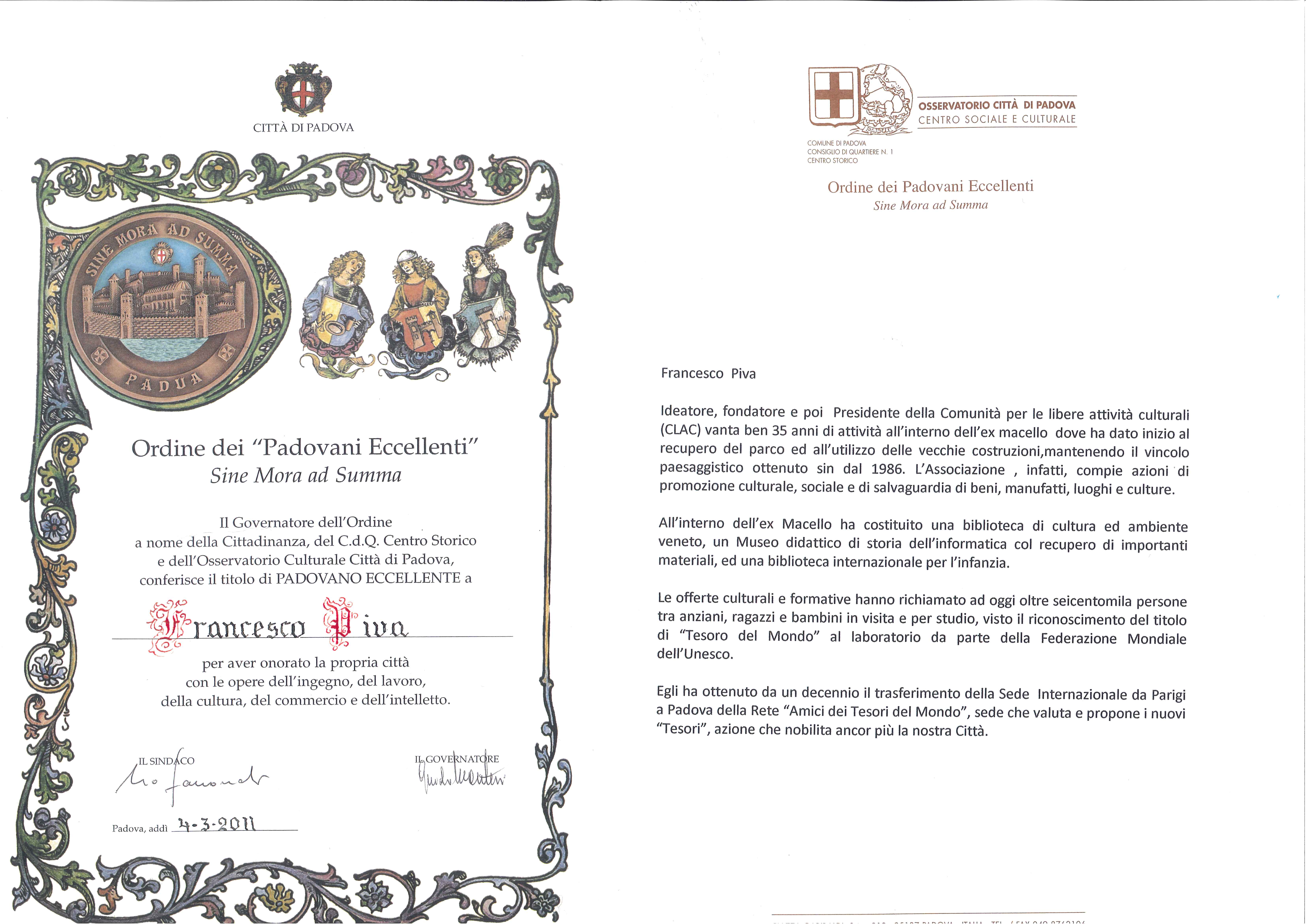 L'Attestato di Padovano Eccellente conferito a Francesco Piva